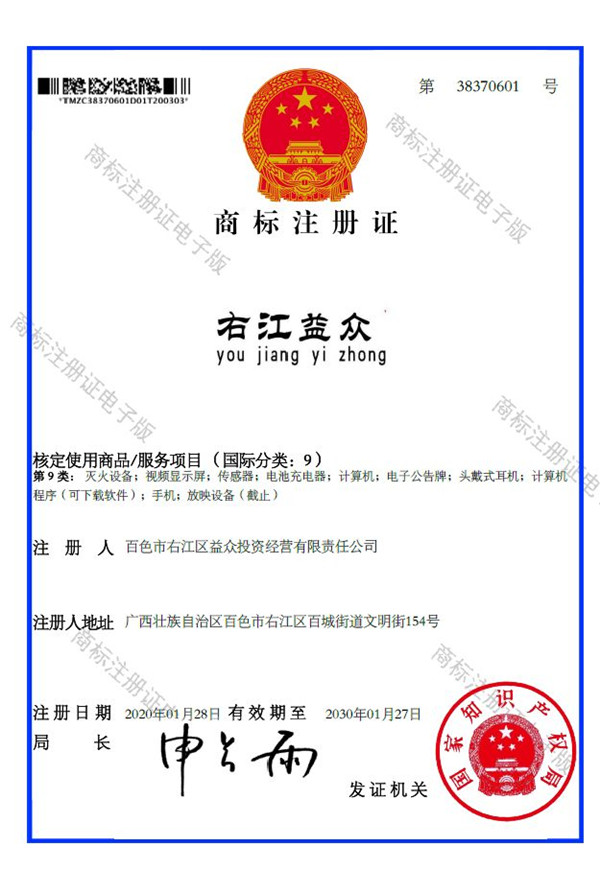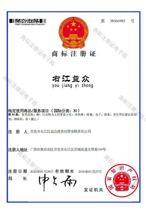 2019年4月,為樹立企業(yè)品牌形象,充分展現(xiàn)品牌價值,廣西百色益眾投資有限公司按照建設(shè)現(xiàn)代企業(yè)的方向和標準,啟動品牌商標注冊申報工作,經(jīng)過6個月的審核期和3個月的公告期,“右江益眾”45個大類商標品牌第一時間成功獲批?!坝医姹姟逼放频某晒ψ裕欣诠靖玫貐⑴c市場競爭,同時,對于強化企業(yè)內(nèi)部管理、樹立良好的企業(yè)形象、提升公司美譽度也可起到積極的助推作用。