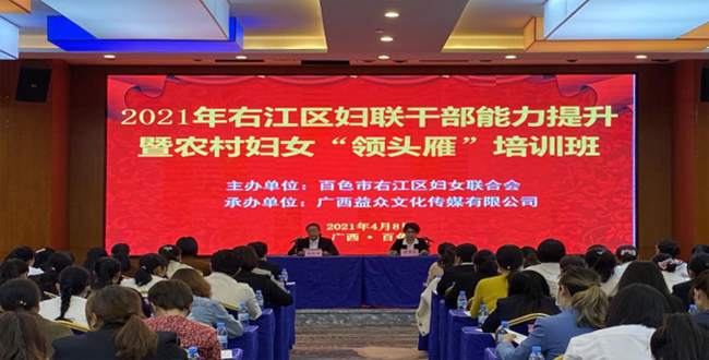 ????????為提高新一屆村(社區(qū))婦聯(lián)主席業(yè)務(wù)水平和履職能力,提升婦女干部的內(nèi)在素質(zhì),盡快進(jìn)入婦聯(lián)工作角色,4月8日至9日,百色市右江區(qū)婦女聯(lián)合會(huì)主辦,廣西益眾文化傳媒有限公司承辦2021年右江區(qū)婦聯(lián)干部能力提升暨農(nóng)村婦女“領(lǐng)頭雁”培訓(xùn)班,來(lái)自各鄉(xiāng)鎮(zhèn)(街道)、村(社區(qū))婦聯(lián)主席或負(fù)責(zé)婦聯(lián)工作同志、執(zhí)委等一百多人參加本期培訓(xùn)。