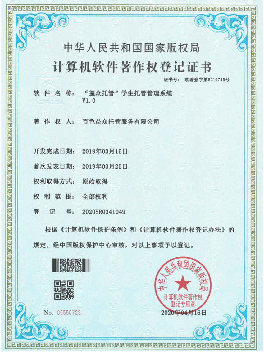 日前,經(jīng)中國版權(quán)保護(hù)中心審核,百色益眾托管服務(wù)有限公司提交的《“益眾托管”學(xué)生托管管理系統(tǒng)》符合《計算機軟件保護(hù)條例》和《計算機軟件著作權(quán)登記辦法》的相關(guān)規(guī)定,被認(rèn)定為原始取得,獲得國家版權(quán)局頒發(fā)《計算機軟件著作權(quán)登記證書》。