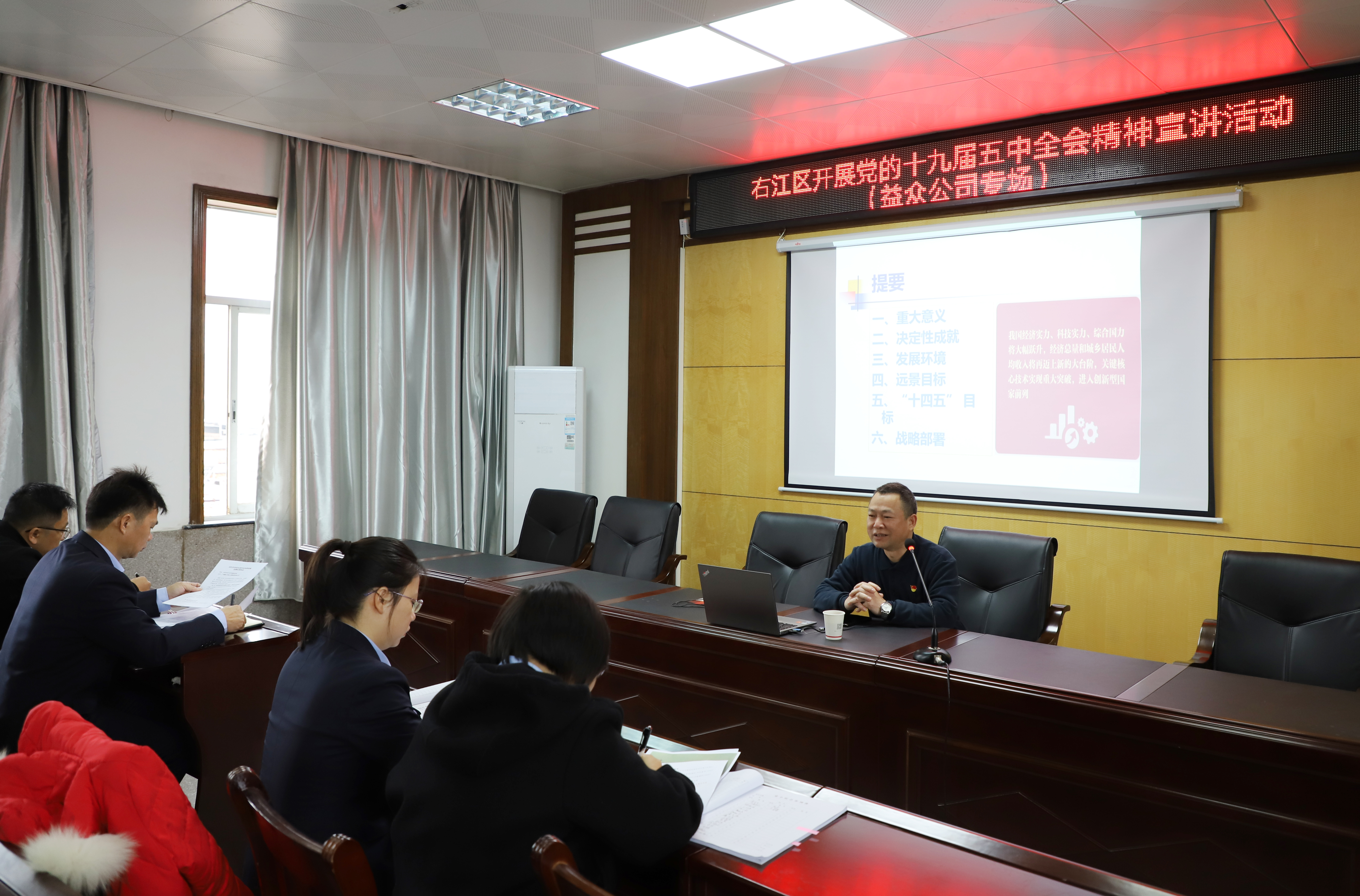 ????????右江區(qū)宣講團黨的十九屆五中全會精神宣講報告會益眾公司專場近日舉行,宣講團成員、區(qū)委黨校講師易祖文作宣講報告。公司領導干部、黨員、入黨積極分子約30人聆聽報告。