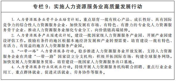 加快人力資源服務(wù)業(yè)高質(zhì)量發(fā)展。推動(dòng)人力資源服務(wù)與實(shí)體經(jīng)濟(jì)融合發(fā)展,引導(dǎo)人力資源服務(wù)機(jī)構(gòu)圍繞產(chǎn)業(yè)基礎(chǔ)高級化、產(chǎn)業(yè)鏈現(xiàn)代化提供精準(zhǔn)專業(yè)服務(wù)。鼓勵(lì)人力資源服務(wù)業(yè)管理創(chuàng)新、技術(shù)創(chuàng)新、服務(wù)創(chuàng)新和產(chǎn)品創(chuàng)新,大力發(fā)展人力資源管理咨詢、高級人才尋訪、人才測評等高技術(shù)、高附加值業(yè)態(tài)。實(shí)施人力資源服務(wù)業(yè)領(lǐng)軍人才培養(yǎng)計(jì)劃。開展“互聯(lián)網(wǎng)+人力資源服務(wù)”行動(dòng)。深化人力資源服務(wù)領(lǐng)域?qū)ν忾_放,探索建設(shè)國家人力資源服務(wù)出口基地。