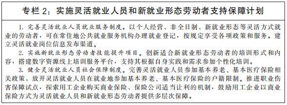 支持多渠道靈活就業(yè)和新就業(yè)形態(tài)發(fā)展。破除各種不合理限制,建立促進(jìn)多渠道靈活就業(yè)機(jī)制,支持和規(guī)范發(fā)展新就業(yè)形態(tài)。鼓勵(lì)傳統(tǒng)行業(yè)跨界融合、業(yè)態(tài)創(chuàng)新,增加靈活就業(yè)和新就業(yè)形態(tài)就業(yè)機(jī)會。加快落實(shí)《關(guān)于維護(hù)新就業(yè)形態(tài)勞動(dòng)者勞動(dòng)保障權(quán)益的指導(dǎo)意見》,建立完善適應(yīng)靈活就業(yè)和新就業(yè)形態(tài)的勞動(dòng)權(quán)益保障制度,引導(dǎo)支持靈活就業(yè)人員和新就業(yè)形態(tài)勞動(dòng)者參加社會保險(xiǎn),提高靈活就業(yè)人員和新就業(yè)形態(tài)勞動(dòng)者社會保障水平。規(guī)范平臺企業(yè)用工,明確平臺企業(yè)勞動(dòng)保護(hù)責(zé)任。健全職業(yè)分類動(dòng)態(tài)調(diào)整機(jī)制,持續(xù)開發(fā)新職業(yè),發(fā)布新職業(yè)標(biāo)準(zhǔn)。