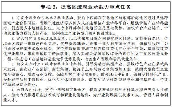 推動(dòng)區(qū)域就業(yè)協(xié)調(diào)發(fā)展。支持東部地區(qū)發(fā)揮創(chuàng)新要素集聚優(yōu)勢,率先實(shí)現(xiàn)產(chǎn)業(yè)升級,開拓高質(zhì)量就業(yè)新領(lǐng)域,培育高質(zhì)量就業(yè)增長極。加快完善中西部和東北地區(qū)基礎(chǔ)設(shè)施,提升產(chǎn)業(yè)集聚區(qū)公共服務(wù)效能,引導(dǎo)產(chǎn)業(yè)向中西部和東北地區(qū)有序梯度轉(zhuǎn)移,推動(dòng)就業(yè)機(jī)會向中西部和東北地區(qū)擴(kuò)散。支持中西部和東北地區(qū)根據(jù)國家戰(zhàn)略導(dǎo)向和發(fā)展重點(diǎn),對接先進(jìn)生產(chǎn)要素和創(chuàng)新資源,發(fā)展特色優(yōu)勢產(chǎn)業(yè),改造提升傳統(tǒng)產(chǎn)業(yè),積極布局新興產(chǎn)業(yè),厚植就業(yè)創(chuàng)業(yè)沃土。