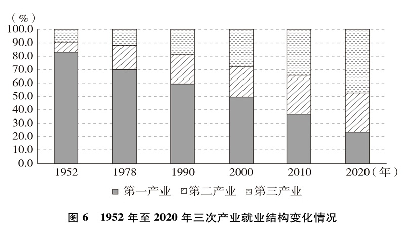 產(chǎn)業(yè)結(jié)構(gòu)優(yōu)化升級(jí)。中國(guó)已建成世界上最完整的產(chǎn)業(yè)體系,產(chǎn)業(yè)發(fā)展持續(xù)向中高端邁進(jìn)。三次產(chǎn)業(yè)增加值之比從1952年的50.5∶20.8∶28.7到2020年的7.7∶37.8∶54.5,中國(guó)從傳統(tǒng)農(nóng)業(yè)大國(guó)成為工業(yè)大國(guó)、服務(wù)業(yè)大國(guó)(圖3),中國(guó)經(jīng)濟(jì)從依賴(lài)單一產(chǎn)業(yè)為主轉(zhuǎn)向依靠三次產(chǎn)業(yè)共同帶動(dòng)。農(nóng)業(yè)現(xiàn)代化成效顯著,機(jī)械化、數(shù)字化、綠色化、功能化、共享化水平明顯提高,廣大農(nóng)民逐步告別“面朝黃土背朝天、一身力氣百身汗”的辛勞,農(nóng)村生產(chǎn)力極大解放;糧食生產(chǎn)能力穩(wěn)步提升,實(shí)現(xiàn)谷物基本自給,中國(guó)人把飯碗牢牢端在自己手中。中國(guó)建成門(mén)類(lèi)齊全、獨(dú)立完整的現(xiàn)代工業(yè)體系,工業(yè)化和信息化融合發(fā)展的廣度和深度不斷拓展,“中國(guó)制造”向“中國(guó)智造”轉(zhuǎn)型升級(jí),產(chǎn)業(yè)鏈供應(yīng)鏈現(xiàn)代化水平進(jìn)一步提升。以新一代信息技術(shù)、生物技術(shù)、高端裝備、綠色環(huán)保為代表的戰(zhàn)略性新興產(chǎn)業(yè)發(fā)展迅速,成為引領(lǐng)高質(zhì)量發(fā)展的重要引擎。數(shù)字經(jīng)濟(jì)激發(fā)經(jīng)濟(jì)發(fā)展新活力,產(chǎn)業(yè)數(shù)字化和數(shù)字產(chǎn)業(yè)化趨勢(shì)加快?,F(xiàn)代服務(wù)業(yè)加速發(fā)展,以“互聯(lián)網(wǎng)+”為標(biāo)志的新業(yè)態(tài)、新模式層出不窮,平臺(tái)經(jīng)濟(jì)、共享經(jīng)濟(jì)蓬勃興起,生產(chǎn)性服務(wù)業(yè)向?qū)I(yè)化和高端化發(fā)展,生活性服務(wù)業(yè)向精細(xì)化和高品質(zhì)轉(zhuǎn)變。產(chǎn)業(yè)結(jié)構(gòu)的優(yōu)化升級(jí)促進(jìn)了經(jīng)濟(jì)更加均衡、更加充分的發(fā)展,人們個(gè)性化品質(zhì)化多樣化需求不斷得到滿足。