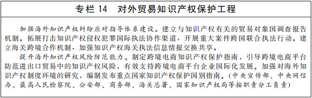 完善維護國家安全的知識產權政策。研究制定事關國家安全的關鍵核心技術知識產權保護規(guī)則。依法管理涉及國家安全的知識產權對外轉讓行為,完善知識產權對外轉讓審查制度。完善知識產權反壟斷、公平競爭相關法律法規(guī)和政策措施。推進我國知識產權有關法律規(guī)定域外適用。研究建立針對進口貿易的知識產權境內保護制度。完善跨境電商知識產權保護規(guī)則。(中央宣傳部、中央網信辦、國家發(fā)展改革委、科技部、工業(yè)和信息化部、商務部、市場監(jiān)管總局、國家國防科工局、國家知識產權局等按職責分工負責)