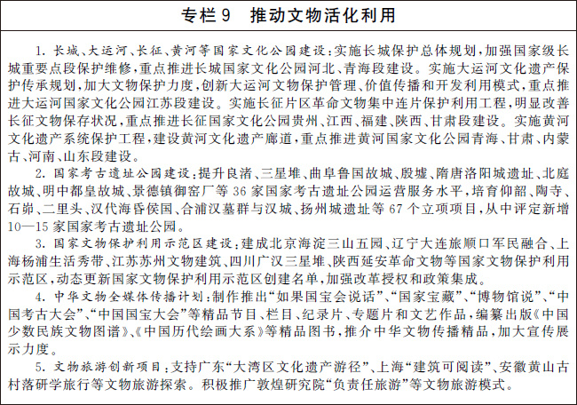 創(chuàng)新文物保護利用機制,加強文物和文化遺產(chǎn)保護利用,建設國家文物保護利用示范區(qū)。健全國有文物資源資產(chǎn)管理制度,推進文物資源資產(chǎn)管理信息共享,部署開展相關試點工作。完善各方主體參與文物保護利用的支持政策,保障利益相關方合法權益。探索創(chuàng)新對文物資源密集區(qū)的支持方式。建設文物領域國家智庫。