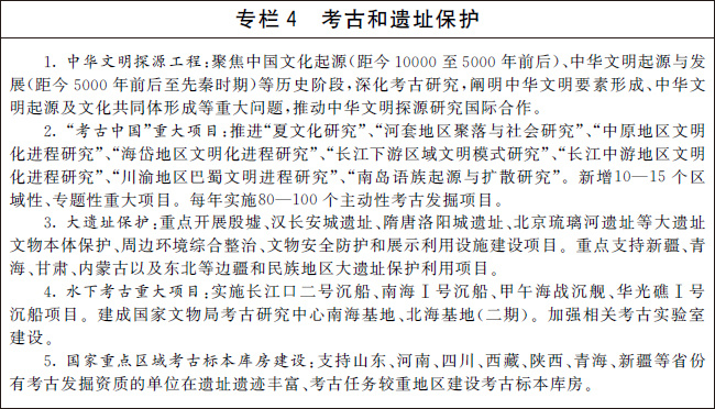編制并實施“十四五”考古工作專項規(guī)劃。系統(tǒng)確定考古發(fā)掘重點,深化中華文明探源工程,推進“考古中國”重大項目,科學闡釋中國境內(nèi)人類起源、文明起源、中華文明形成、統(tǒng)一多民族國家建立和發(fā)展、中華文明在世界文明史中的重要地位等關鍵問題,揭示中華文明的歷史文化價值和核心特質(zhì)。