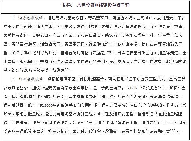 優(yōu)化暢通水運(yùn)設(shè)施網(wǎng)絡(luò)。建設(shè)京津冀、長三角、粵港澳大灣區(qū)世界級港口群,支持山東打造世界一流的海洋港口,推進(jìn)東北地區(qū)沿海港口一體化發(fā)展,優(yōu)化港口功能布局,推動(dòng)資源整合和共享共用。有序推進(jìn)沿海港口專業(yè)化碼頭及進(jìn)出港航道等公共設(shè)施建設(shè)。適度超前建設(shè)糧食、能源、礦產(chǎn)資源的接卸、儲存、中轉(zhuǎn)設(shè)施,推進(jìn)沿海沿江液化天然氣碼頭規(guī)劃建設(shè)。提升內(nèi)河港口專業(yè)化、規(guī)模化水平,合理集中布局集裝箱、煤炭、鐵礦石、商品汽車等專業(yè)化碼頭。加強(qiáng)內(nèi)河高等級航道擴(kuò)能升級與暢通攻堅(jiān)建設(shè),完善長江、珠江、京杭運(yùn)河和淮河等水系內(nèi)河高等級航道網(wǎng)絡(luò),進(jìn)一步提升珠三角高等級航道網(wǎng)出海能力,全面加強(qiáng)長三角、珠江—西江高等級航道網(wǎng)未達(dá)標(biāo)段建設(shè)。推動(dòng)重要支流航道和庫湖區(qū)航道、內(nèi)河旅游航道、便民碼頭建設(shè)。