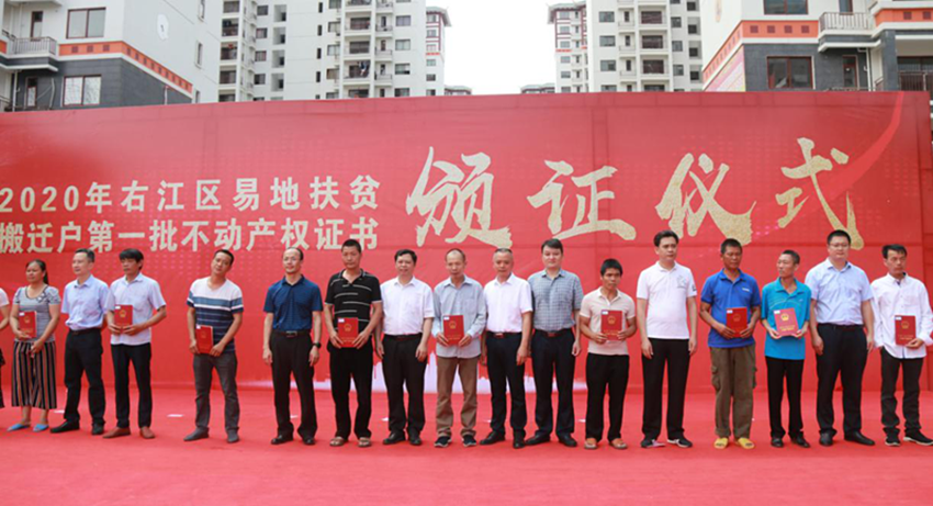 5月16日上午,右江區(qū)“老鄉(xiāng)家園—迎龍易地扶貧搬遷安置小鎮(zhèn)”搬遷戶不動(dòng)產(chǎn)權(quán)證書頒證儀式在安置小鎮(zhèn)舉行,第一批26戶搬遷戶順利拿到了產(chǎn)權(quán)證書。百色市發(fā)改委副主任、市水庫(kù)和扶貧易地安置管理局局長(zhǎng)羅加攀,右江區(qū)委常委、區(qū)人民政府副區(qū)長(zhǎng)岑萬興,右江區(qū)委常委、宣傳部部長(zhǎng)、區(qū)人民政府副區(qū)長(zhǎng)王世凡,右江區(qū)委常委、辦公室主任盧靈及右江區(qū)直單位、鄉(xiāng)鎮(zhèn)代表,廣西百色益眾投資有限公司董事長(zhǎng)、總經(jīng)理趙家臣出席儀式。儀式由王世凡主持。